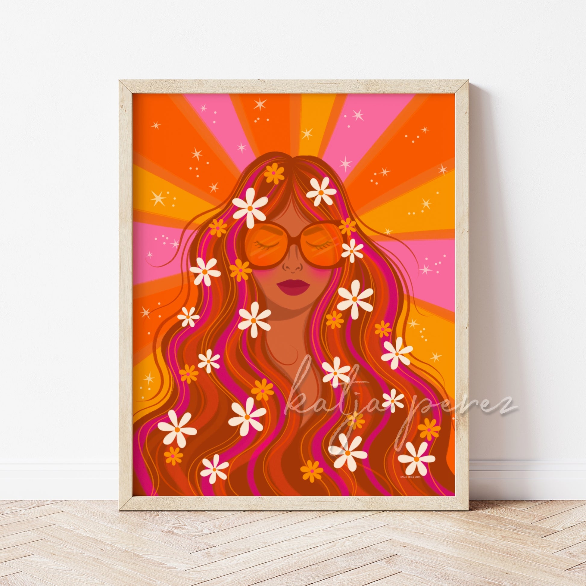 This retro-inspired illustration captures the essence of the 70’s with its groovy vibe and flower power aesthetic. The daisy, a symbol of new beginnings and true love, is a beautiful complement to the her carefree spirit. The bright colors in the background add to the retro feel of the artwork, evoking memories of a bygone era. This illustration is perfect for anyone who loves all things retro, and for those who appreciate the beauty and simplicity of nature. With its cheerful and uplifting energy, this artwork is sure to bring a smile to anyone's face.