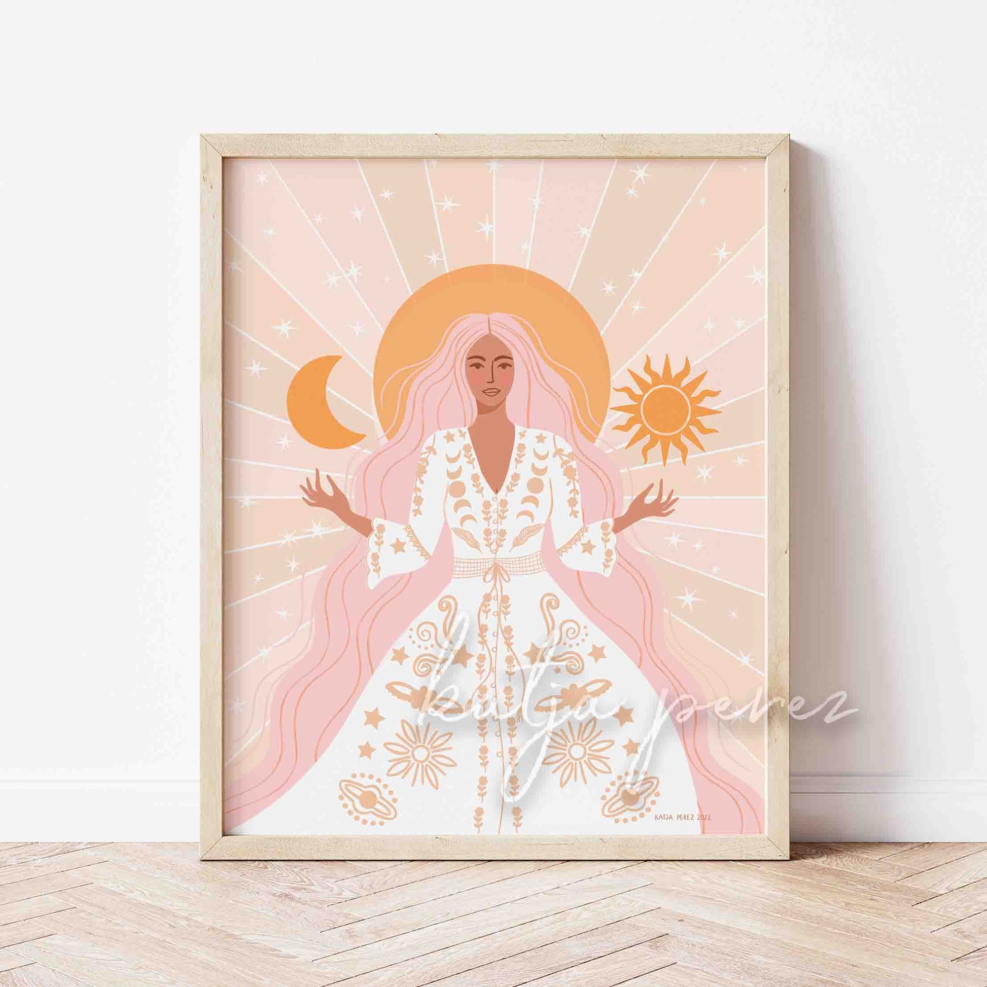 Bring the magic of the celestial sun and moon goddess into your home with our art print. Capturing the vibes of divine femininity and the energy of the goddess, this print features a celestial goddess holding the sun and the moon in her hands. A perfect reminder of the balance, power and beauty of the goddess energy and the sun and moon in your life.
