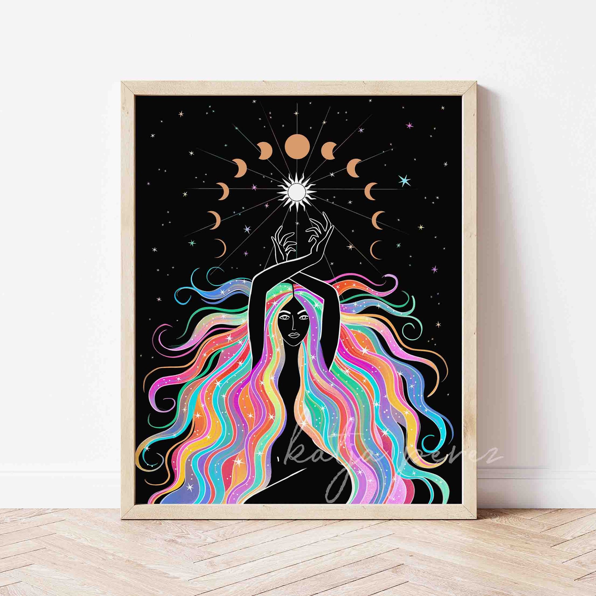 Unleash the power of the divine feminine with our Cosmic Rainbow Goddess art print. Featuring a radiant rainbow and a burst of colors, this piece symbolizes the ever-changing phases of the universe and the moon. Allow the energy of this print to bring balance and harmony to your space, and let it serve as a reminder of the strength and beauty of the feminine energy.