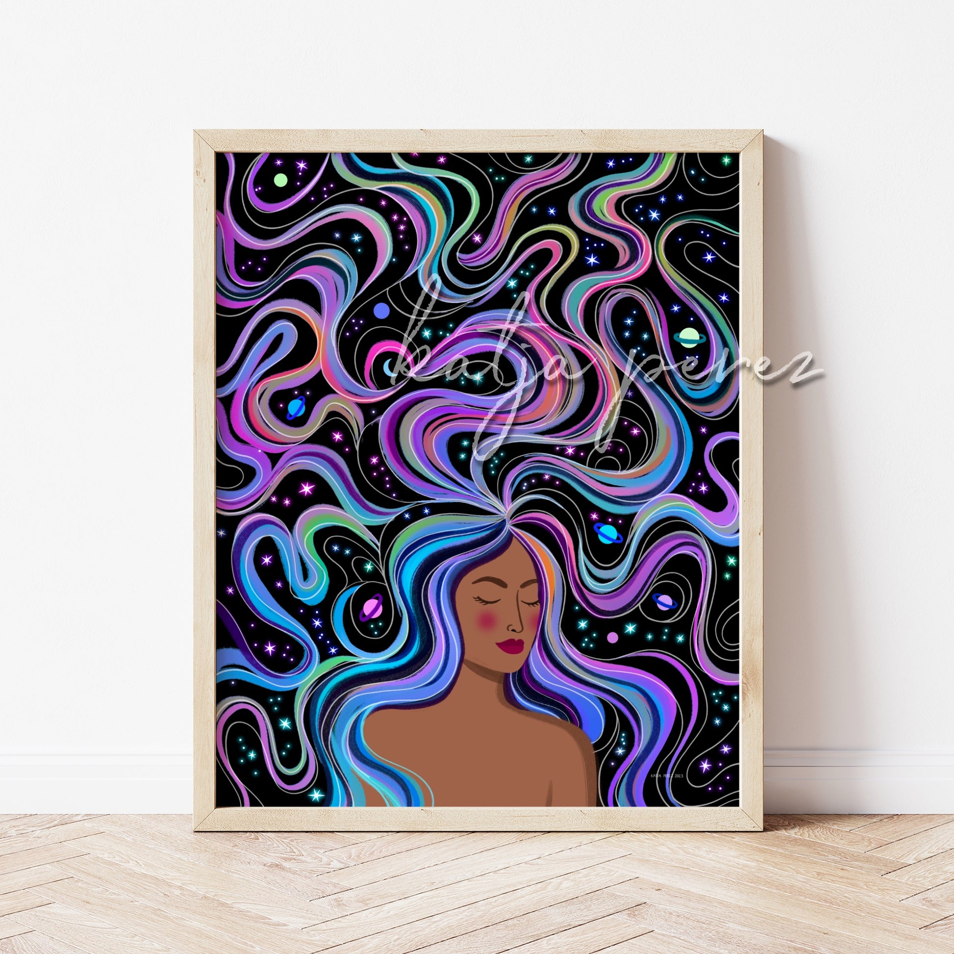 This magical art print, captures the beauty and grace of the universe. With rainbow hair and swirls of color, this piece represents the divine feminine energy and the connection to the cosmic realm. It serves as a reminder of the strength and power of the female spirit and to embrace one's unique journey.