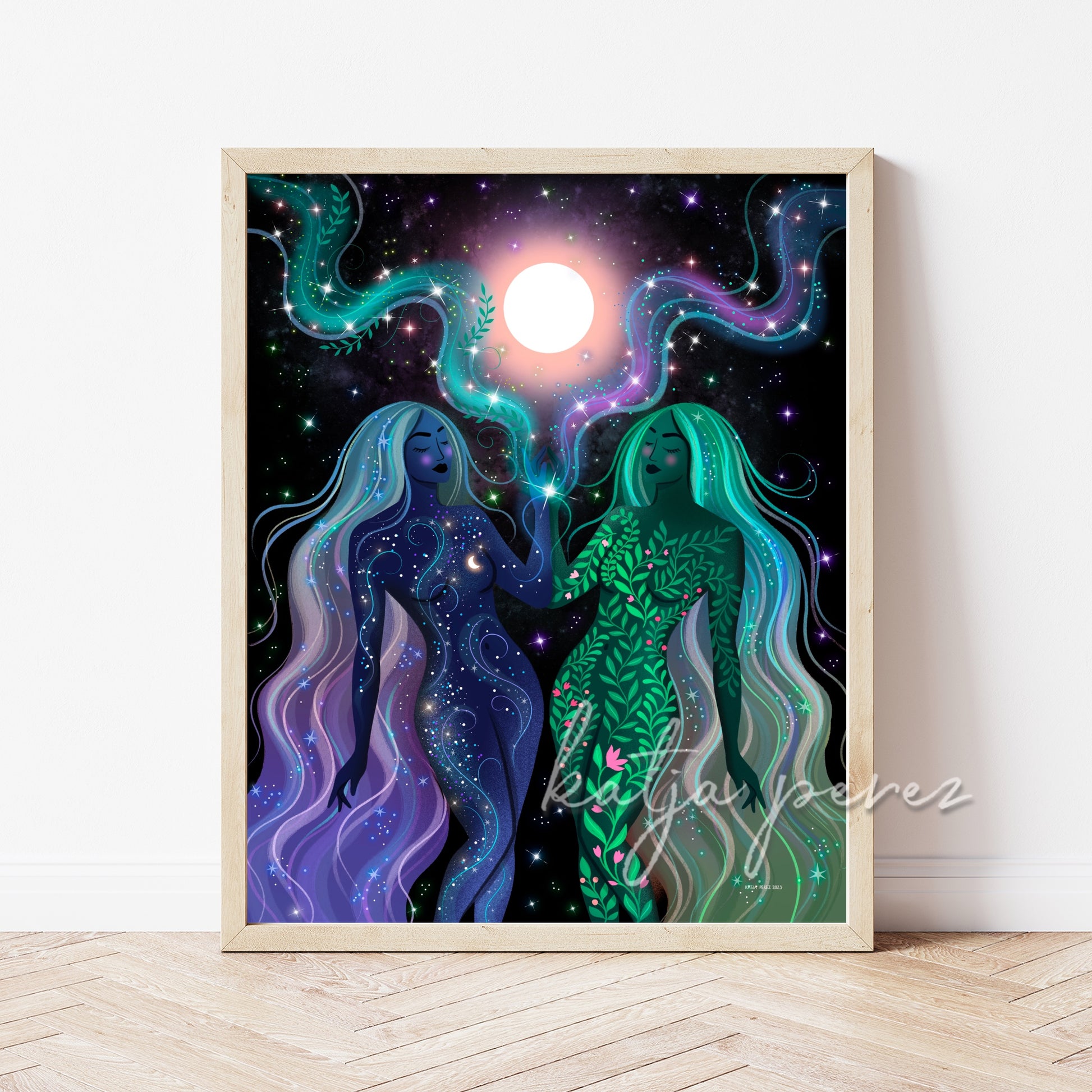 Embrace the connection between the stars and the soil with this artwork, where two goddesses—one with the night sky, the other with the essence of nature—blend their energies. It's a simple, powerful reminder of how the universe and earth are linked, much like our own lives. Let this piece ground you like the earth and inspire you like the stars. Perfect for anyone looking to bring a touch of the cosmos into their home.