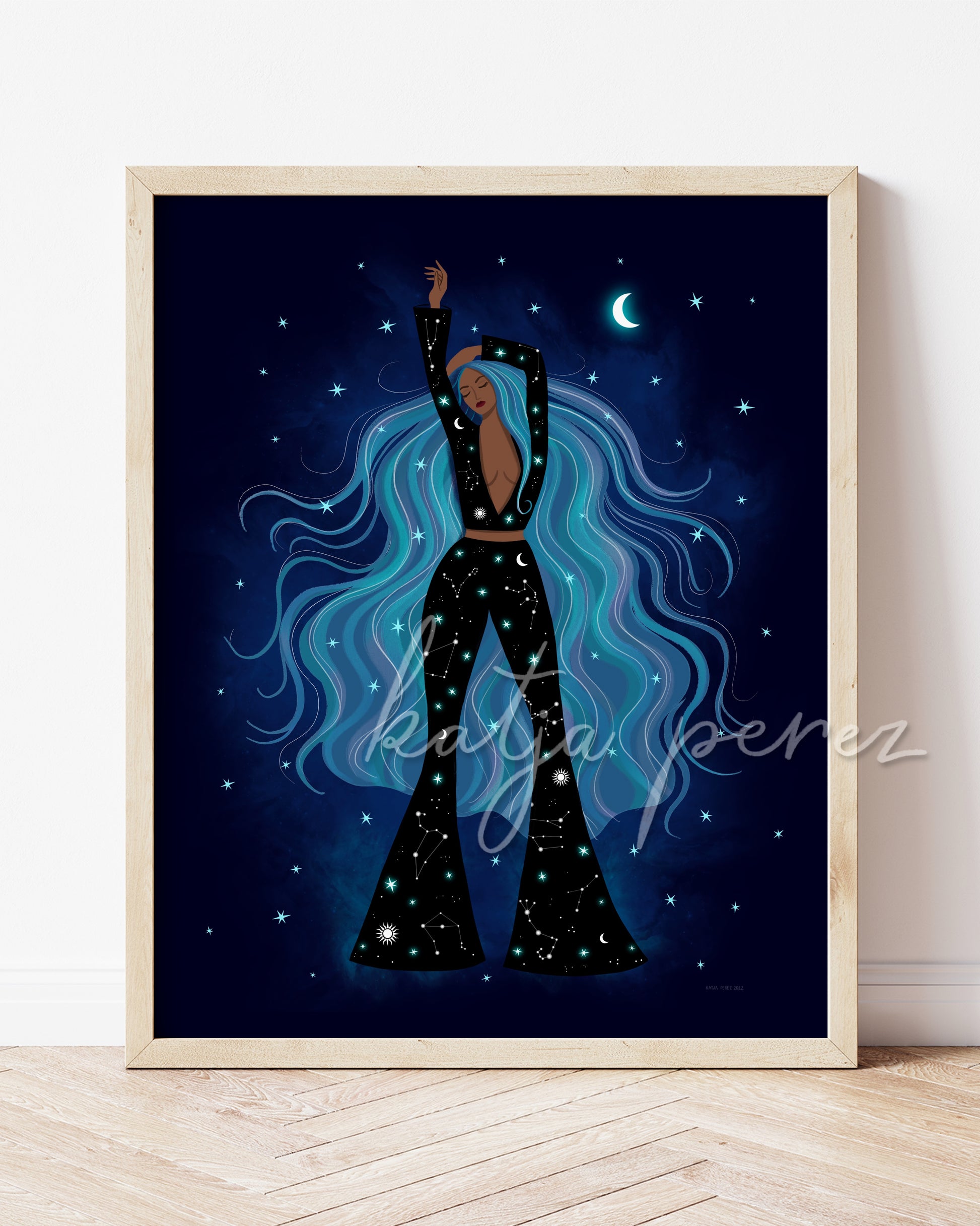 Get groovy with our Dancing Goddess art print. This retro inspired piece captures the magic of the 70's and the goddess energy of disco. The illustration depicts a goddess dancing, in a celebration of femininity and the connection to the cosmic realm. This piece serves as a reminder to embrace the strength and beauty of the female spirit and to let yourself be free and wild.