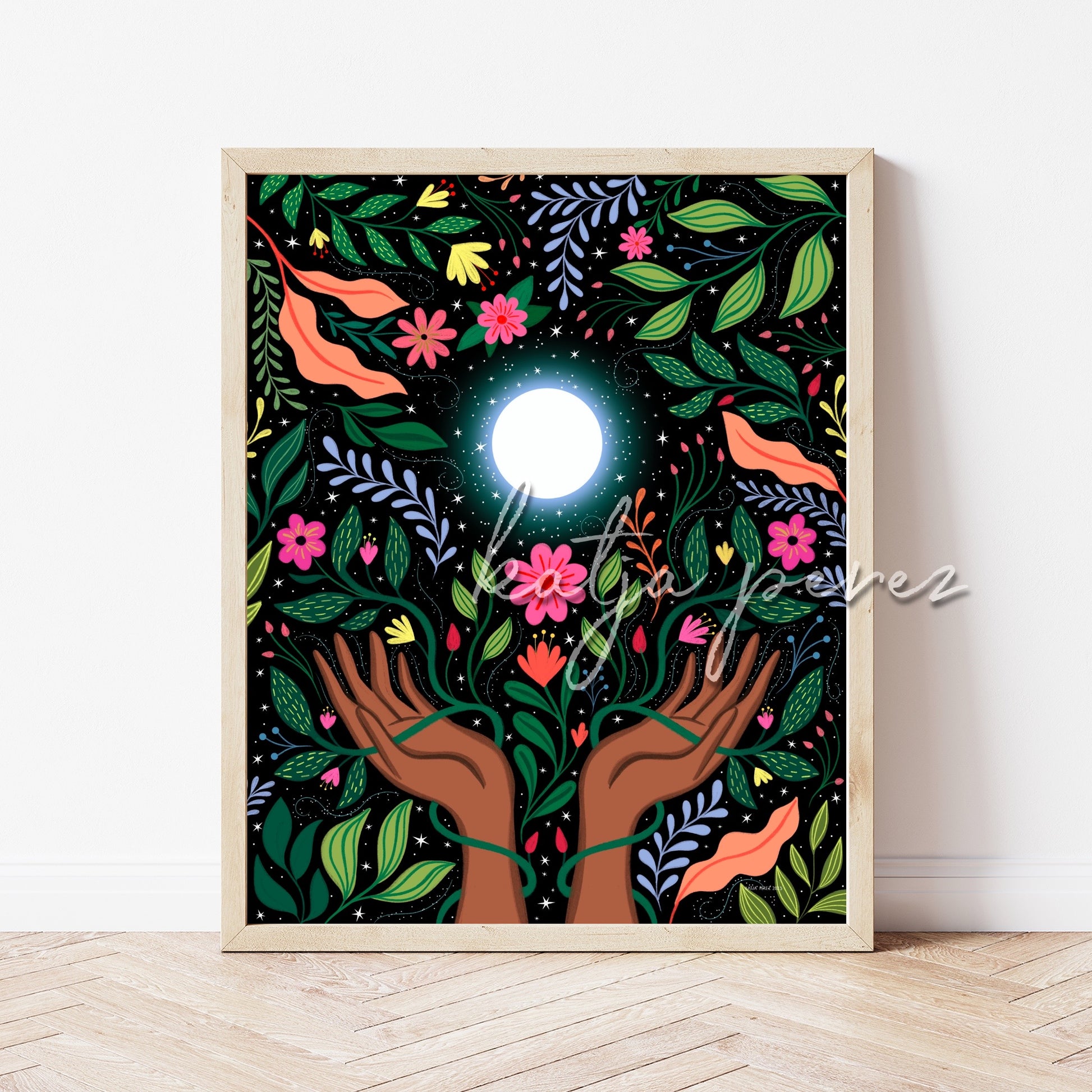 Feel the energy of nature and the full moon with our Full Moon in Bloom art print. The illustration of hands reaching towards a full moon surrounded by vibrant plant life, representing the connection to the cosmic realm and the natural world. This piece serves as a reminder to honor the beauty and strength of the natural world, and to embrace the energy of the full moon and the burst of colors it brings.