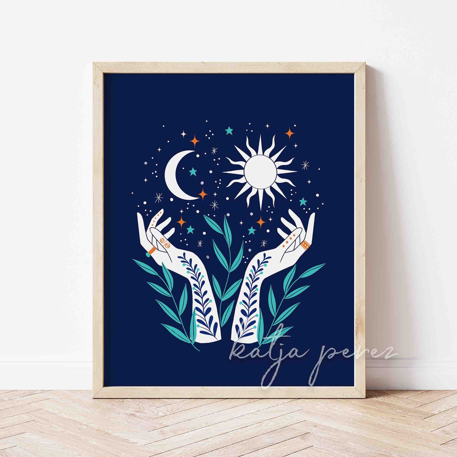 Unleash your inner magic with our Magic Hands art print. The illustration of hands surrounded by celestial elements, such as the sun, moon, and stars, evokes a sense of witchy vibes and powerful magic. This piece serves as a reminder to tap into the power of the elements and to harness the magic within us. The intricate details of the hands and the celestial elements are beautifully captured in this print, making it a perfect addition to any witchy home.