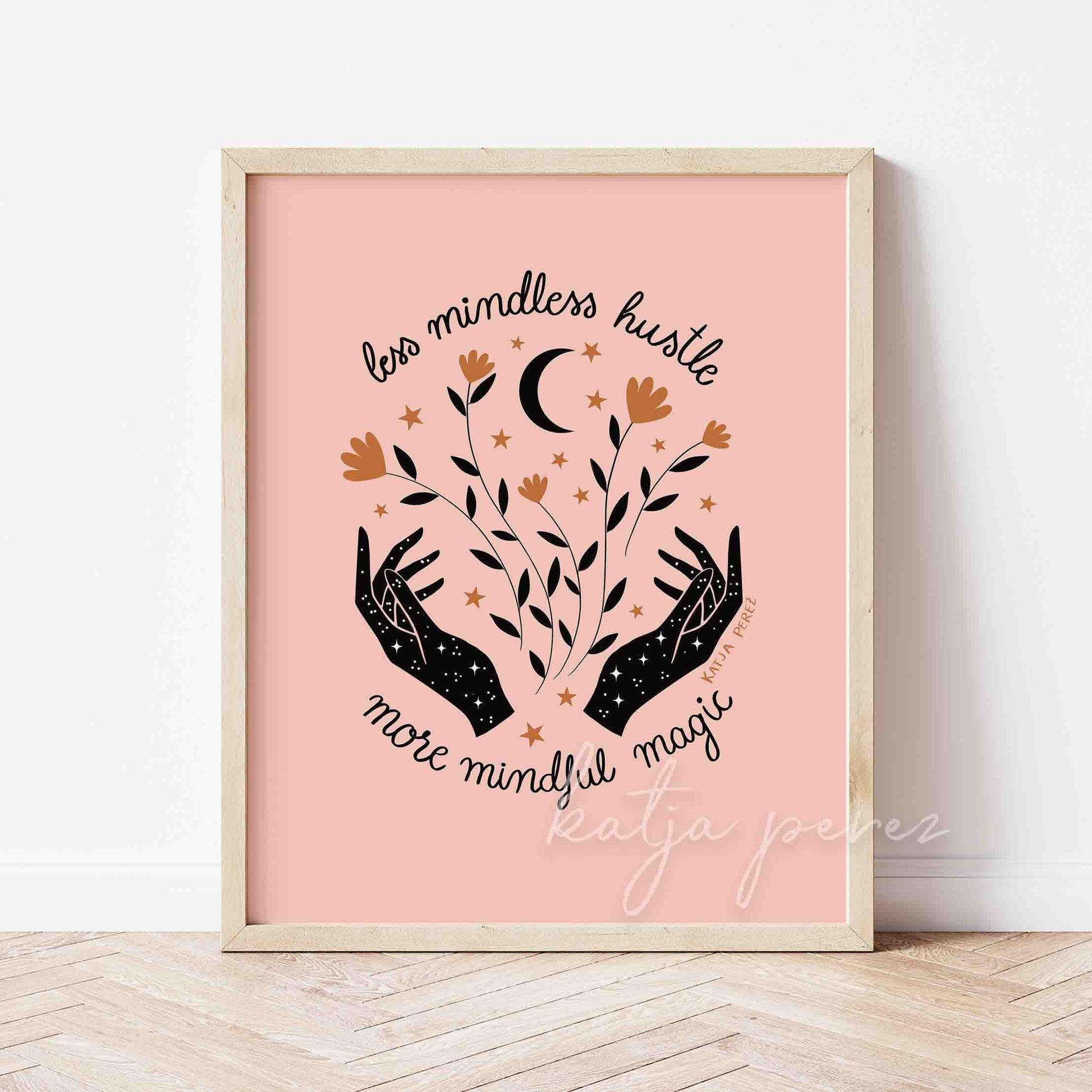 Enhance your home with the More Mindful Magic art print. With its hand-lettered quote, this print serves as a daily reminder to focus on positivity and reduce stress. It's a visual representation of the energy and power of mindfulness. The perfect addition to any room for those looking to improve their mental well-being.