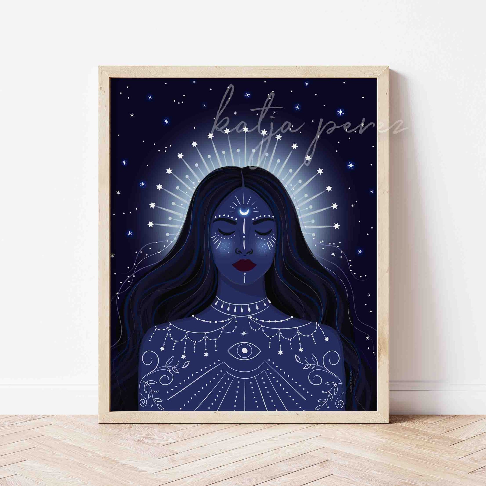 Experience the power of meditation with our Glowing art print. The illustration of a goddess with a moon-glow halo and intricate drawings on her body represents the connection to the cosmic realm and the inner goddess. This piece serves as a reminder to embrace the beauty and strength of the feminine energy and to honor the connection to the universe through the practice of meditation.