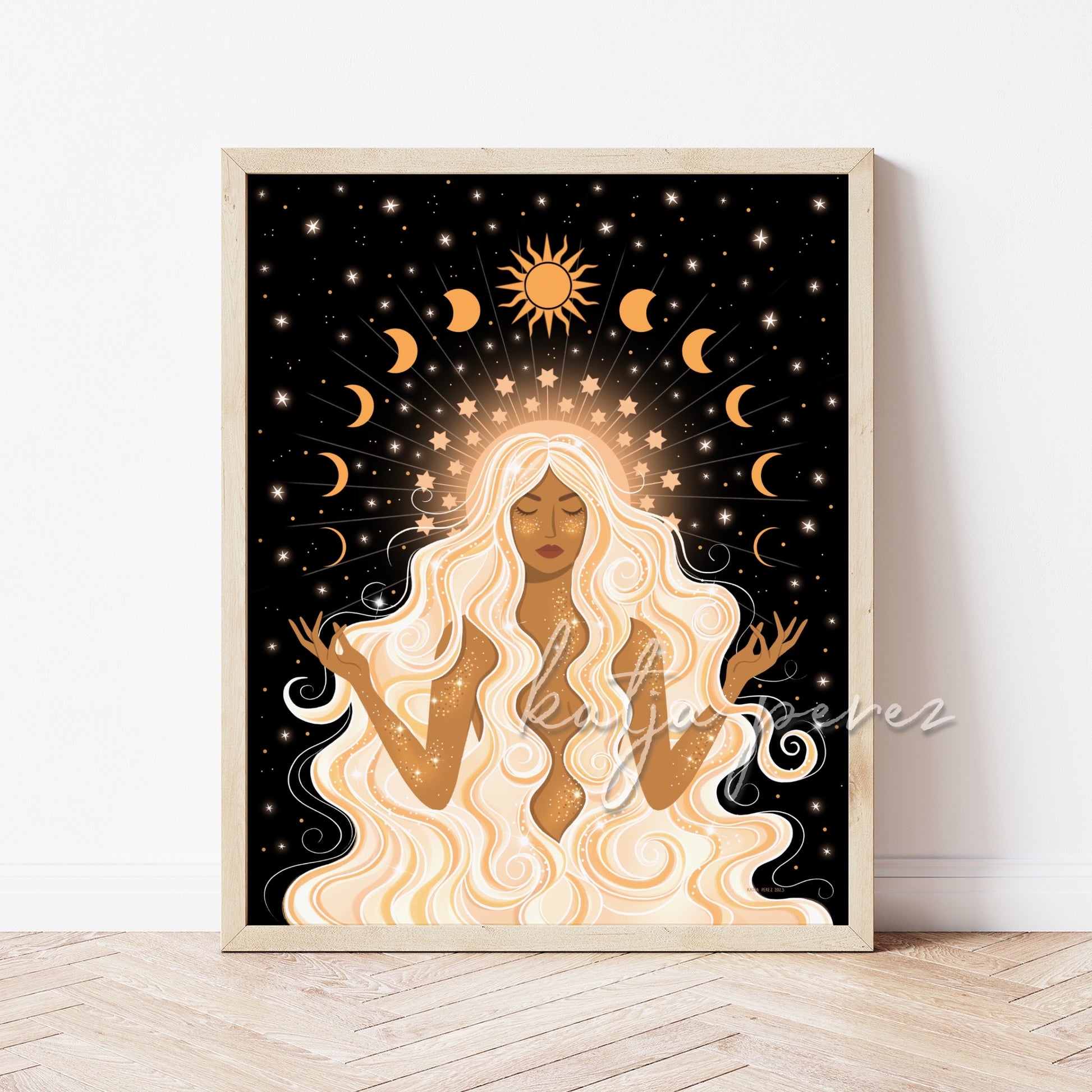This "Glowing Golden Goddess" art print showcases the divine femininity and celestial energy of a goddess bathed in golden light with glittering stars and celestial elements. The depiction of the moon phases represents the cyclical energy of the feminine, reminding us of the magic and power of the divine feminine within us all. Embrace the glowing goddess within you!