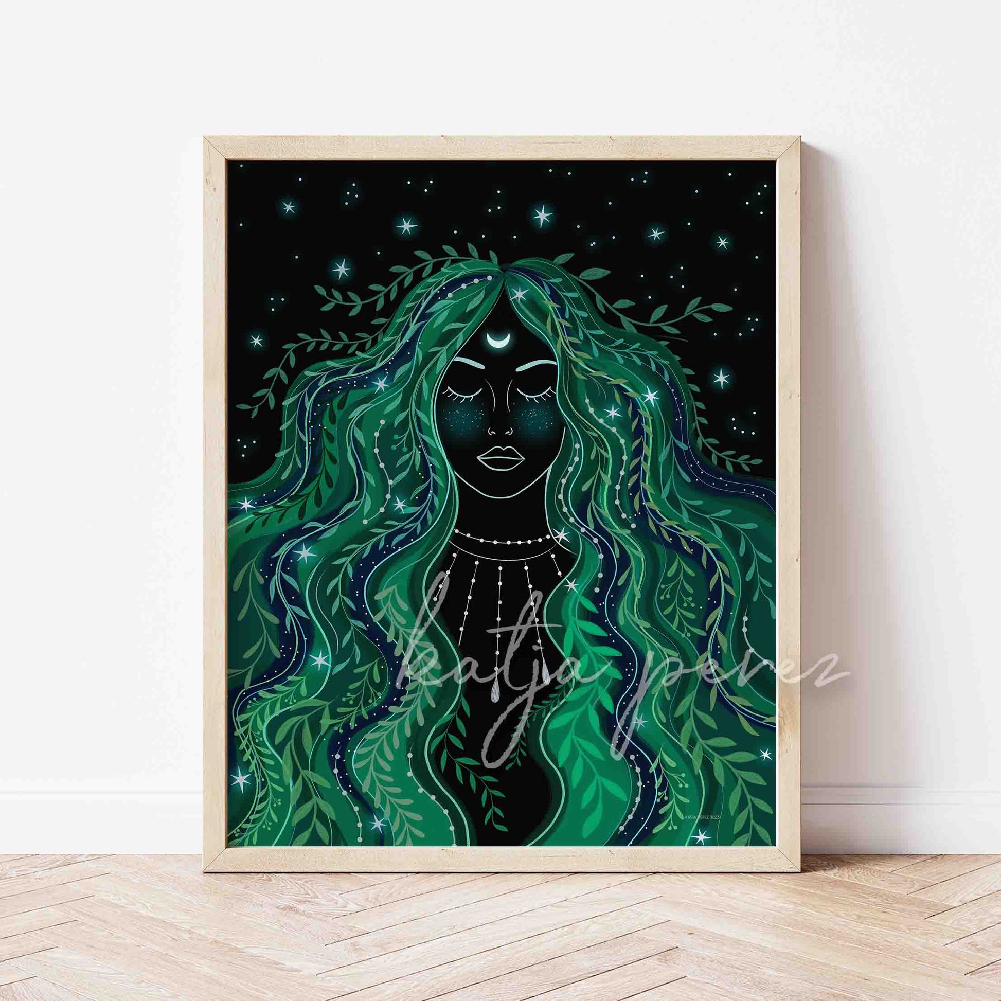Unleash the power of manifestation with the "Green Goddess" art print. This striking portrait features a serene goddess with plants, stars and sparkles in her hair, representing the connection of nature and the universe. This piece serves as a visual reminder to meditate on your goals and let the universe work its magic. Add a touch of elegance and inspiration to any room with this beautiful and unique art print.