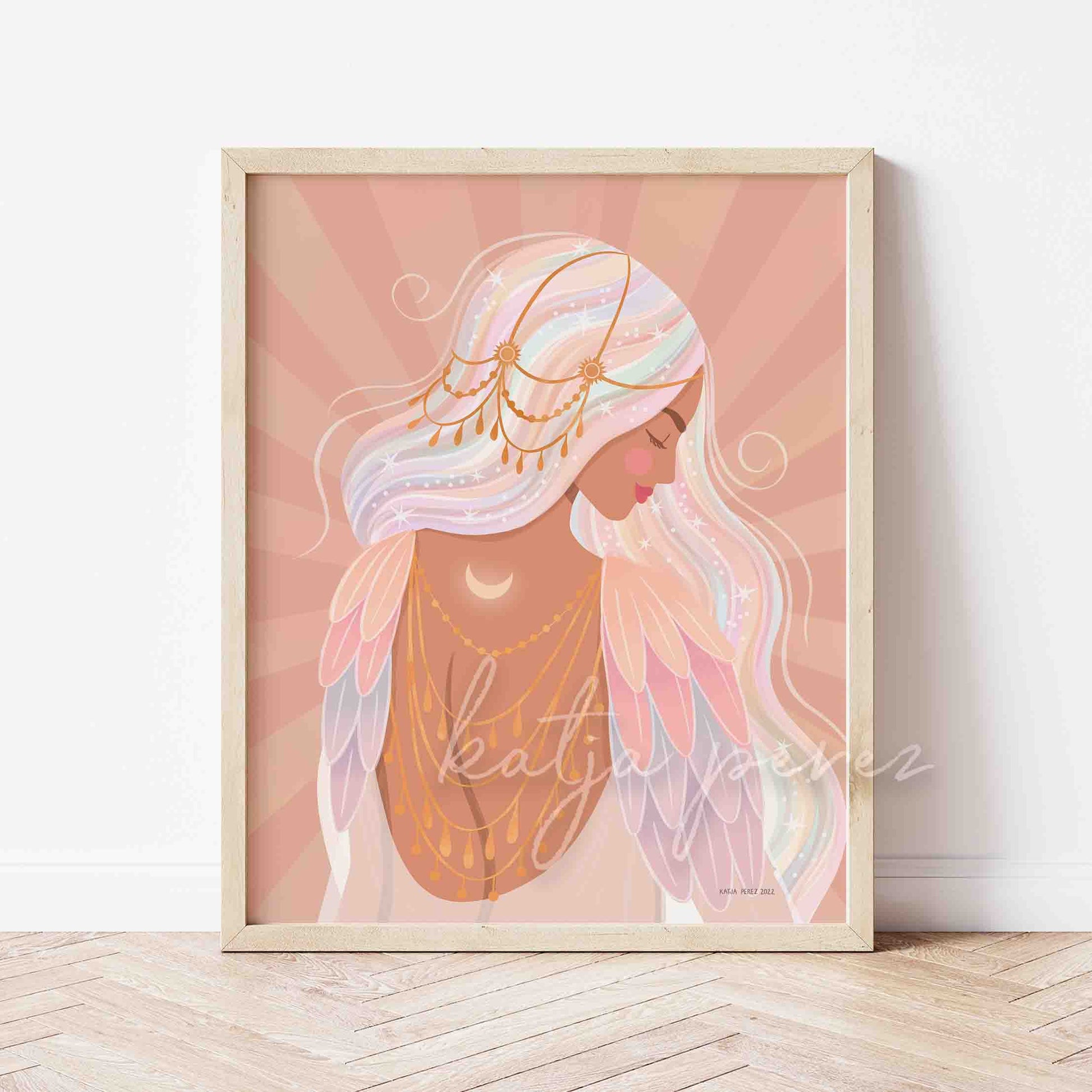 Bring a touch of serenity to your home with the "Half Moon Goddess" art print. This piece features a goddess with a glowing half-moon on her skin, adorned in gold jewelery and adorned with warm and soft pastel colors. The bright and colorful design of this print is sure to bring a sense of calm and positivity to any room. Add a touch of elegance and inspiration to any room with this beautiful and unique art print.