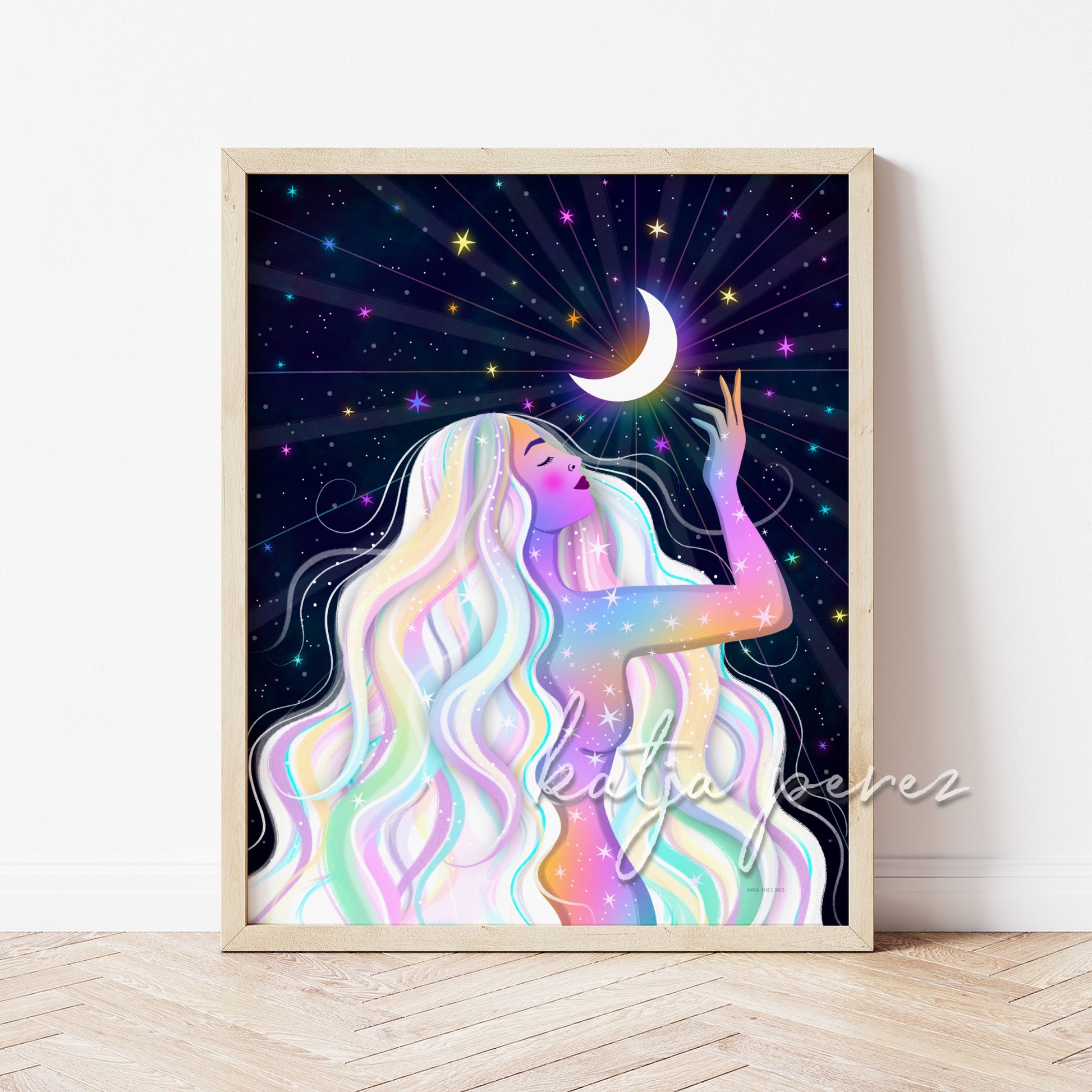 Embrace the magic of the universe with our Holographic Colors Moon Goddess art print. The illustration of a goddess looking up to a half-moon and stars around her, rendered in holographic colors, represents the connection to the cosmic realm and the inner goddess. This piece serves as a reminder to honor the beauty and strength of the feminine energy, and to embrace the wonder and awe of the universe.