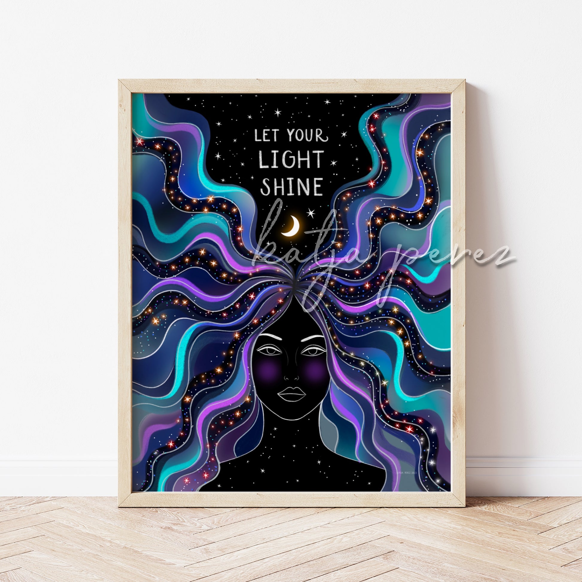 Elevate your energy and let your light shine with our Let Your Light Shine art print. The illustration of a goddess in the universe, with a positive hand-lettered quote above her, serves as a reminder to embrace the cosmic energy within us, and to let our inner light shine. Her flowing bright strands of hair create a beautiful pop of color on the black background. It's a powerful visual representation of the power of positive affirmations and letting your inner goddess shine.