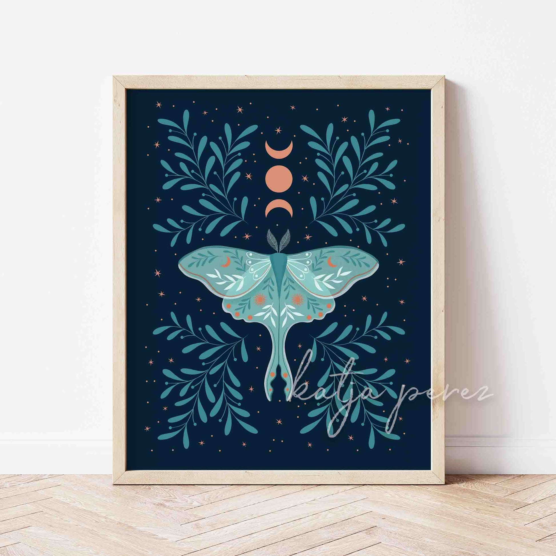 Discover the magic of nature with our Luna Moth art print. The illustration of a delicate luna moth, surrounded by decorative plants, stars, and moon phases, represents the beauty and wonder of nature. The luna moth is a symbol of transformation and rebirth, and this piece serves as a reminder to embrace the beauty and magic that surrounds us in the natural world. The soft colors and the intricate details of the moth and plants are beautifully captured in this print, making it a perfect addition to any nature lover's home.