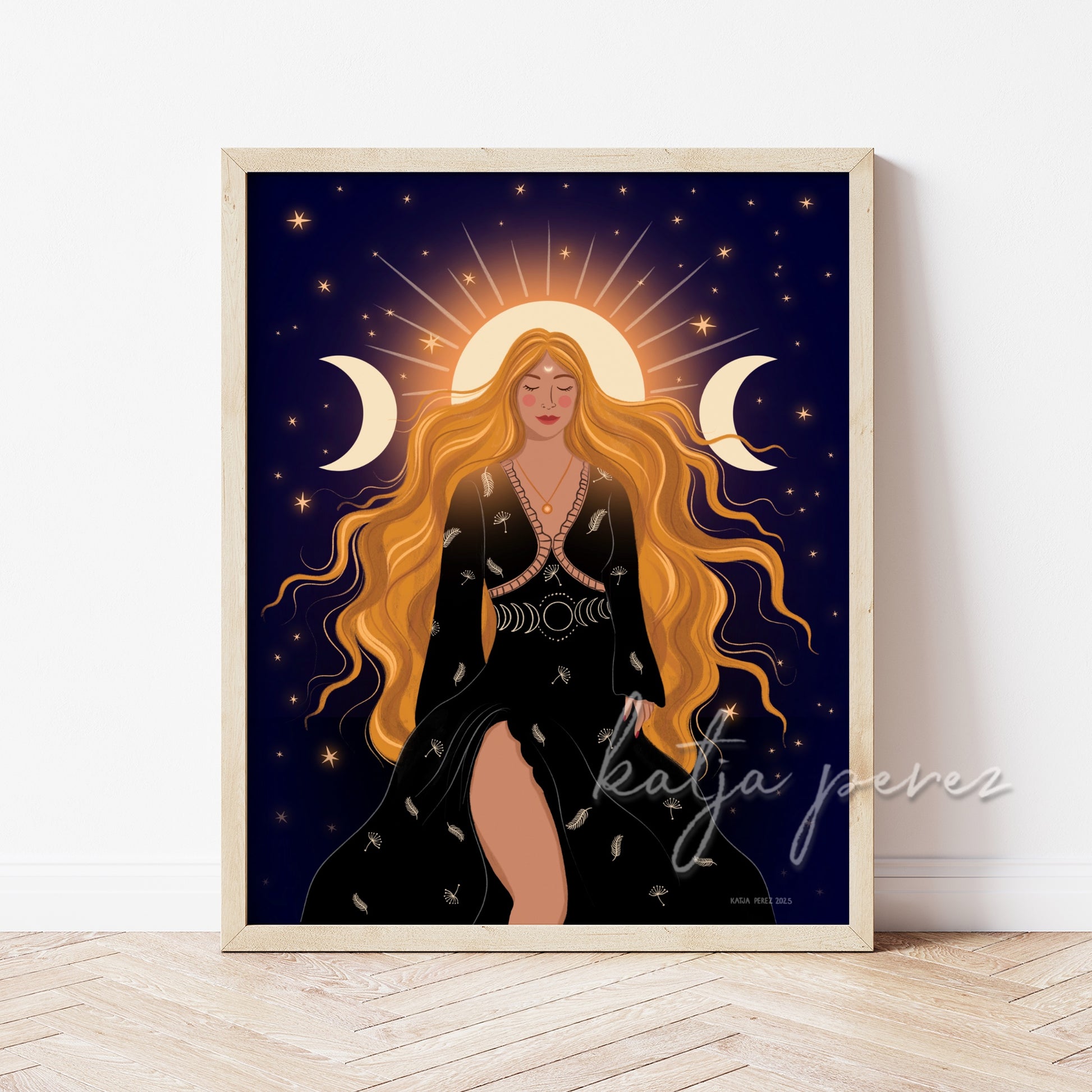 Stillness, strength, and lunar magic. She's in her element — grounded yet cosmic, soft yet powerful — standing under the full moon with open arms and open heart. This piece carries the energy of moon rituals, feminine cycles, and quiet transformation. For the ones who move with the moon, trust their intuition, and believe in their own sacred rhythm.