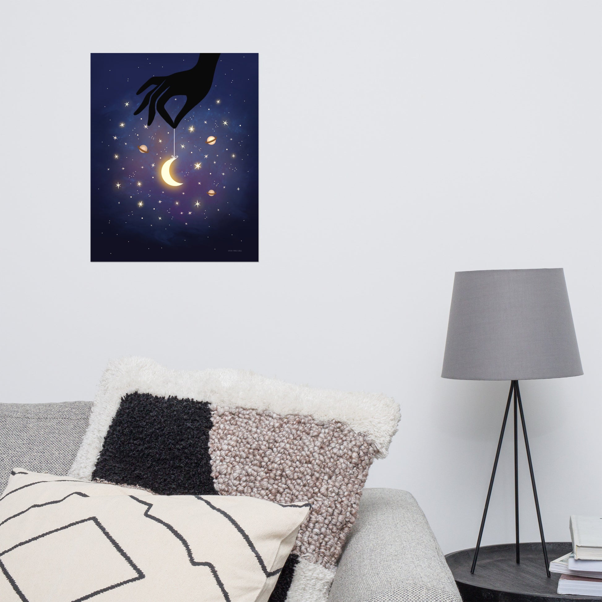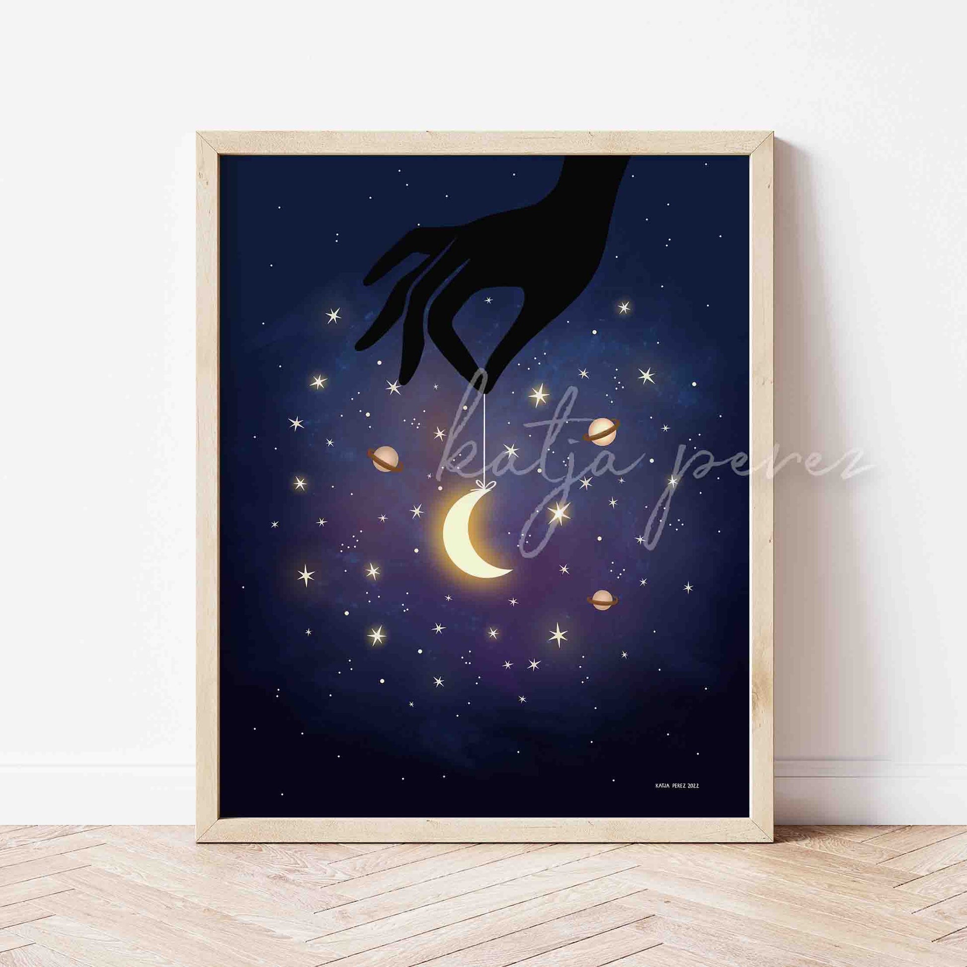 Bring the beauty of the universe into your home with the "Moon Ornament" art print. This piece features a glowing moon and sparkling stars on a galaxy background, all illuminated to create a mesmerizing effect. This print is a perfect reminder of the wonder and awe that the universe holds, and it's a great way to add a touch of elegance and inspiration to any room. Hang it on your wall and let the universe energy flow in your home.