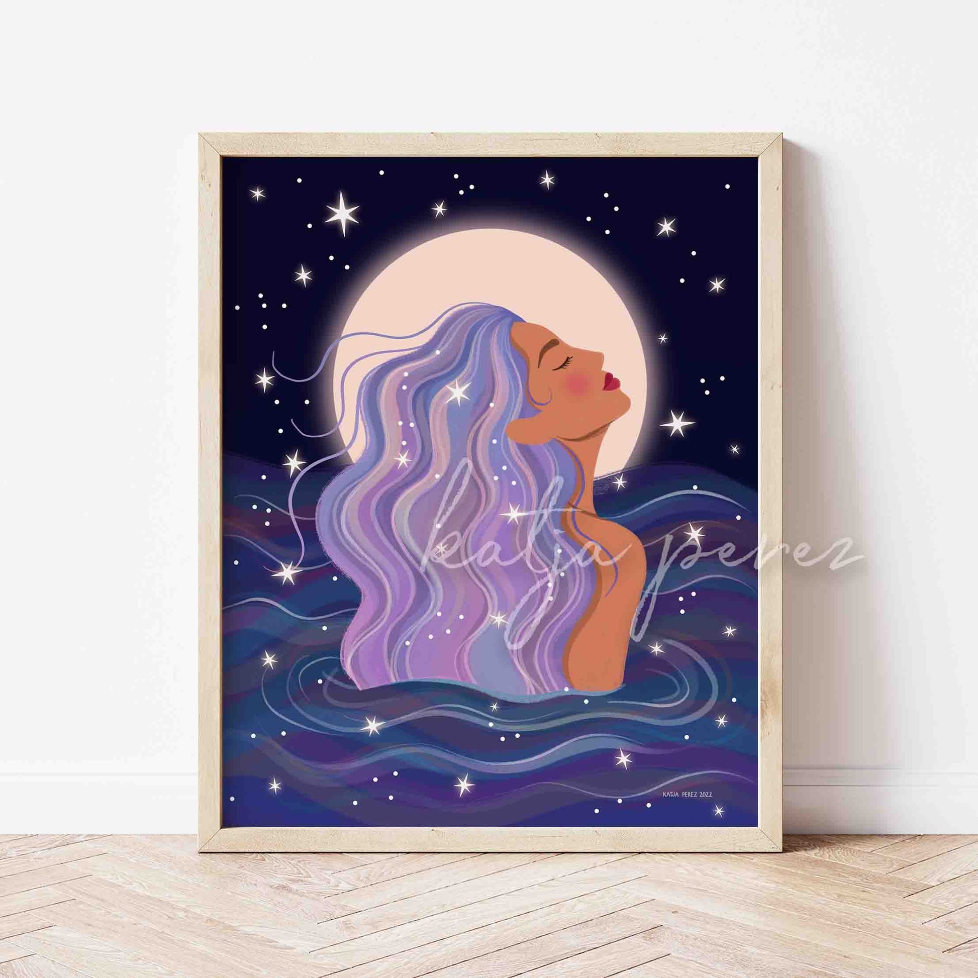 Elevate your space with the Moonlight Ocean art print, featuring a goddess bathing in the ocean under the light of a full moon, surrounded by stars and a colorful flowy composition. This print captures the magic and beauty of the night and the ocean. Perfect for those who love goddess imagery and the beauty of nature.