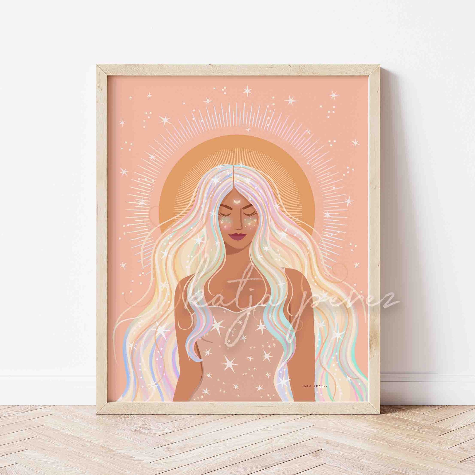 Elevate your space with the New Moon Intentions art print, featuring a goddess surrounded by stars and a new moon, bathed in soft pastel shades of pink and soft colors. This print captures the energy of new beginnings and the feminine power of the goddess, making it a perfect addition to any room for those who love goddess imagery.