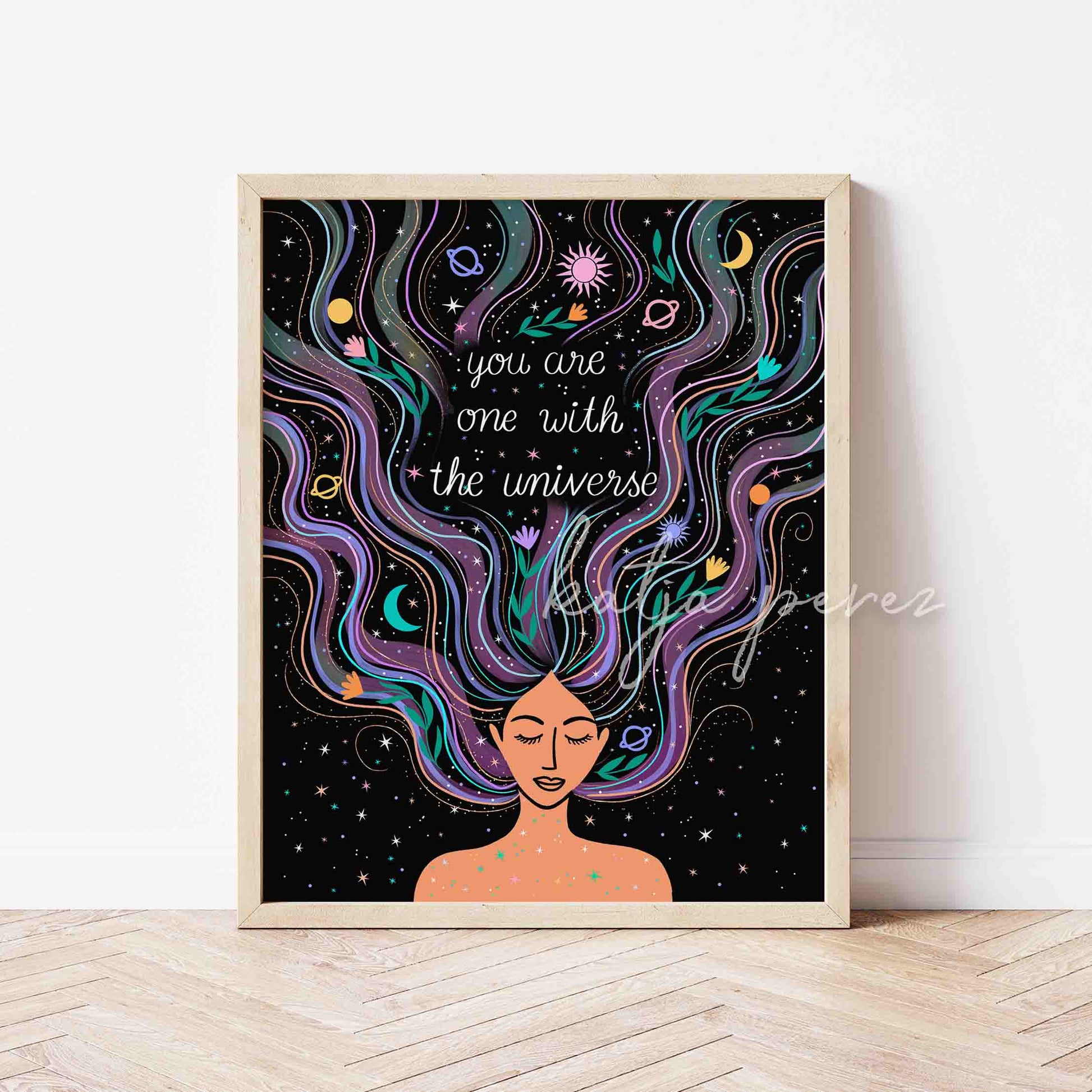 This art print, One With the Universe, features a hand-lettered quote set against a cosmic background with celestial elements and flowing hair. This print is a reminder to connect with the universe and embrace the vastness of space. The elegant font and beautiful imagery make it a stunning addition to any room. Let it inspire you to align with the cosmic energy and feel one with the universe.