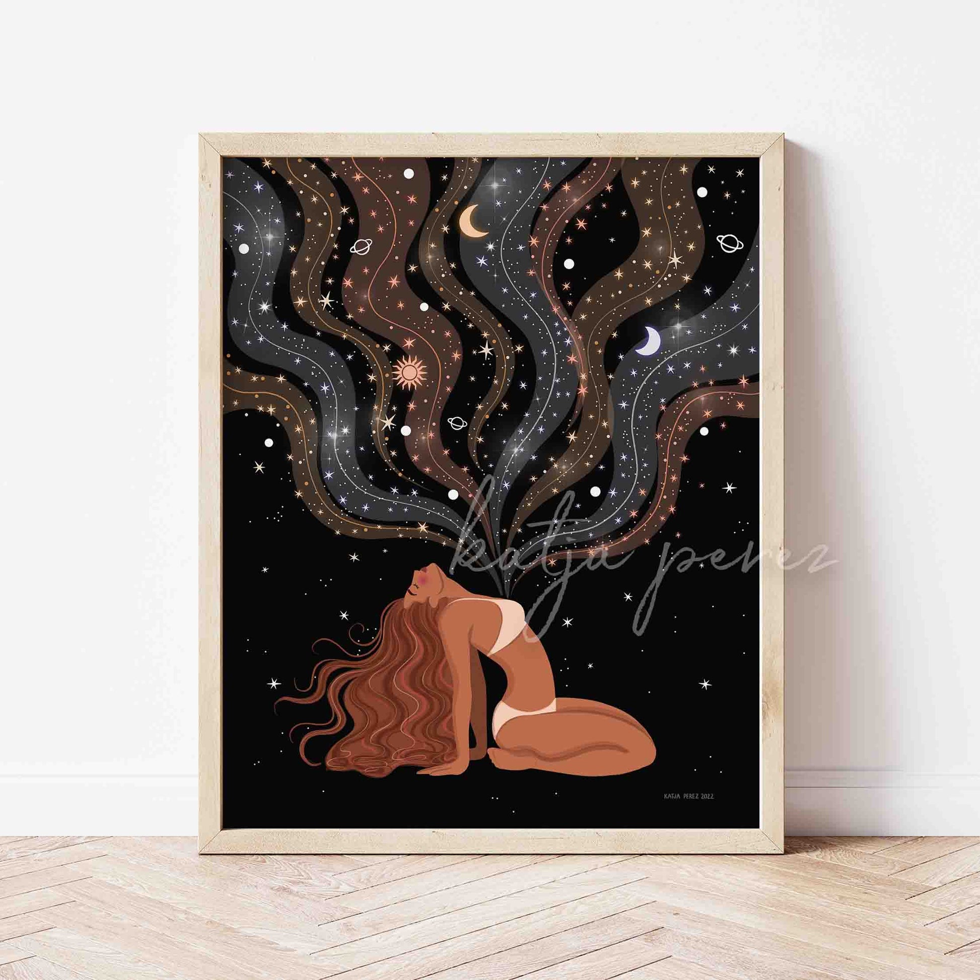 Unlock your inner magic with this art print, Open Heart. A burst of energy flows from a goddess's open heart, reminding us of the cosmic magic within us all. Embrace your goddess energy and open your heart to the universe.