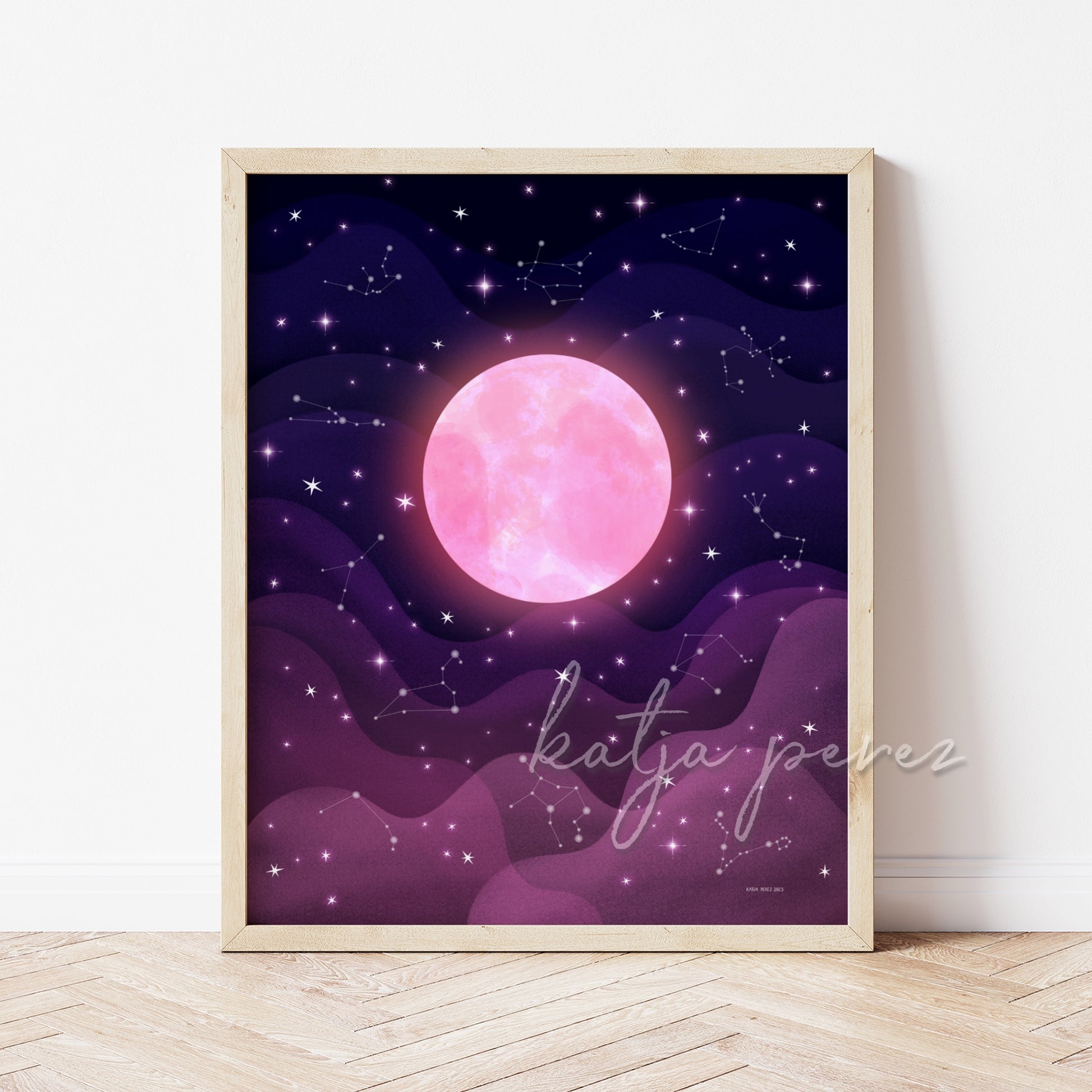 "Pink Moon" is a captivating illustration that celebrates the beauty of the April full moon. This moon, known as the pink moon, is named after the blooming pink wildflowers that appear during this time of year. The illustration features a luminous pink moon, casting a gentle glow against a starry backdrop. The zodiac stars are carefully placed throughout the artwork, inviting the viewer to explore the depths of their own zodiac sign under the influence of the pink moon. "Pink Moon" is a beautiful and enchanting illustration that inspires reflection and introspection, offering a moment of peace and tranquility during this special time of year. Whether displayed as part of a full moon ritual or as a stunning piece of wall art, "Pink Moon" is a magical addition to any space.