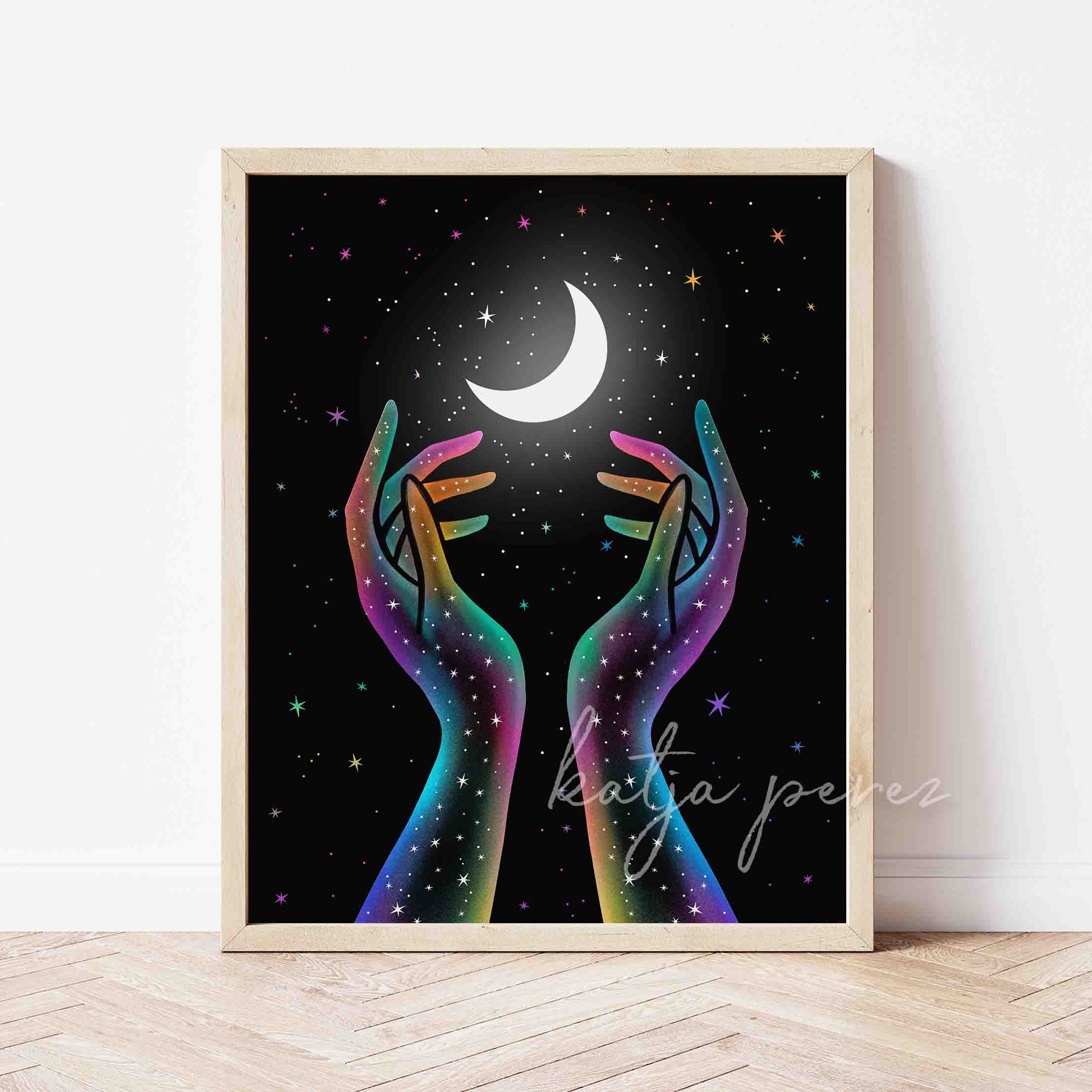 The unique art print, "Rainbow Hands" features a stunning rainbow color gradient and depicts hands reaching towards a glowing moon amidst a cosmic and galaxy background. This print captures the essence of witchy vibes and the connection to the universe. Add a pop of color to your home or office with this beautiful piece.