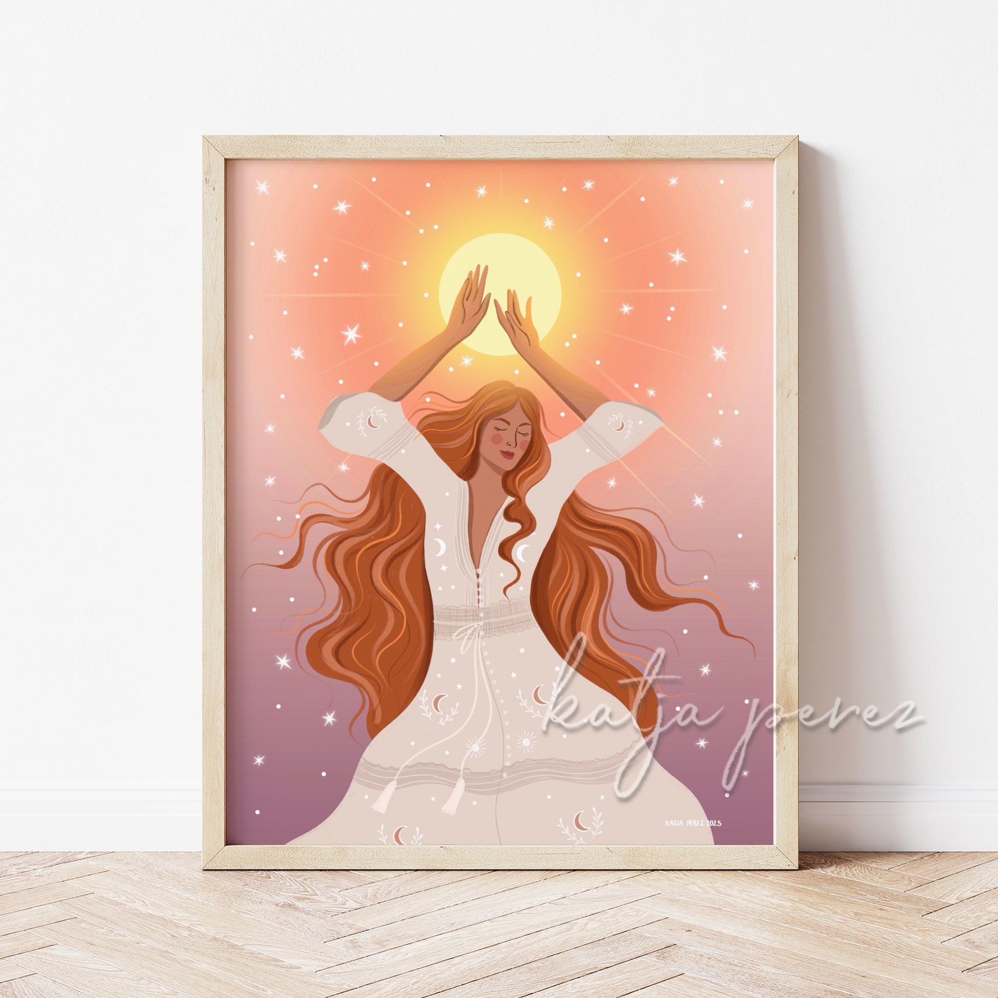 Golden hour glow meets soft power. She's grounded, dreamy, and a little witchy — channeling sun energy with closed eyes and wild hair. For lovers of boho vibes, slow magic, and that quiet moment where everything just clicks.