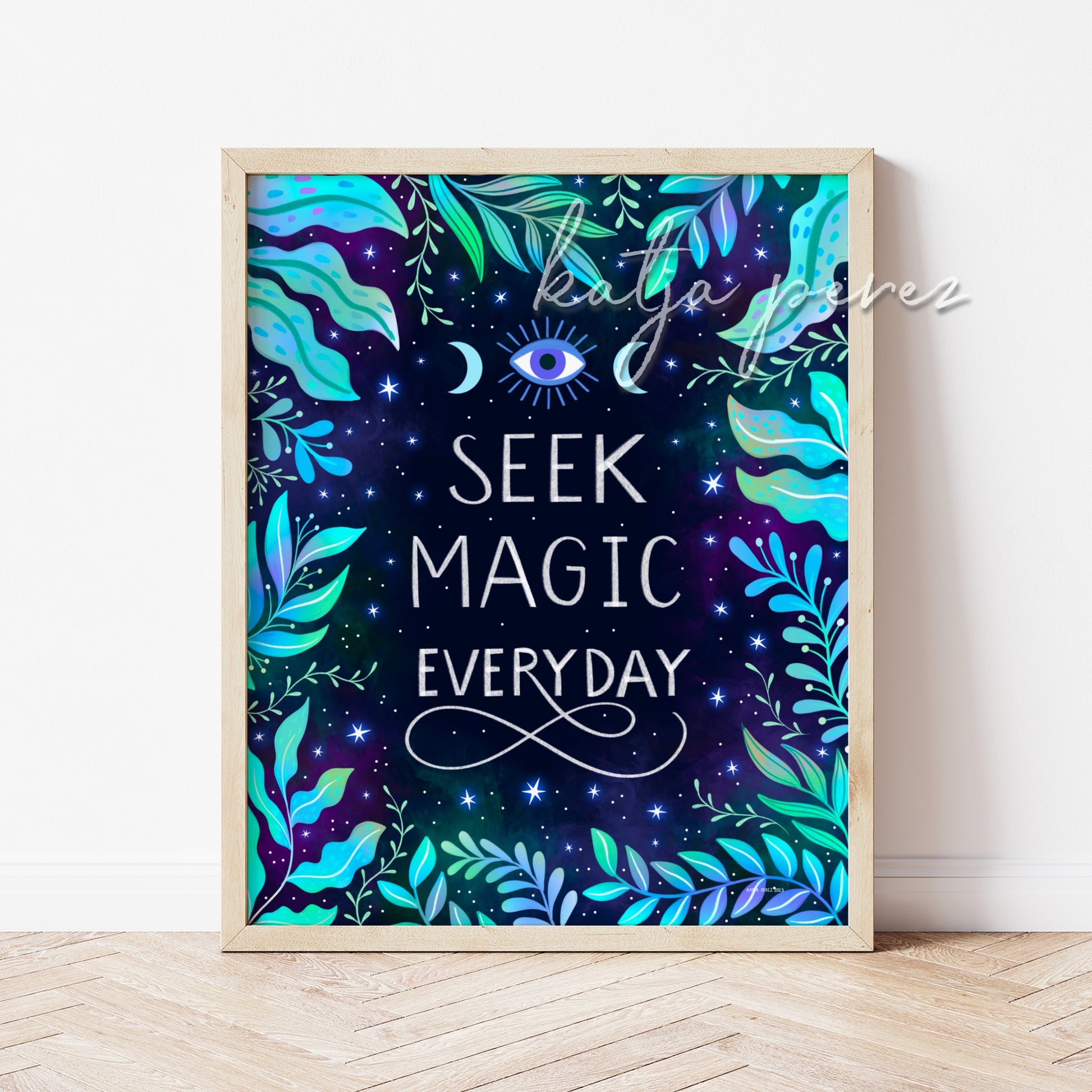 "Seek Magic Everyday" is a stunning art print that is sure to brighten up any room. Featuring a quote surrounded by vibrant plants and glowing stars, this print is a reminder to embrace the magic in everyday life. With its bold colors and uplifting message, this print is a perfect addition to your home, office, or studio. Whether you're looking to add a touch of inspiration to your space or simply looking for a beautiful piece of art, "Seek Magic Everyday" is the perfect choice. Order now and bring the magic into your life!