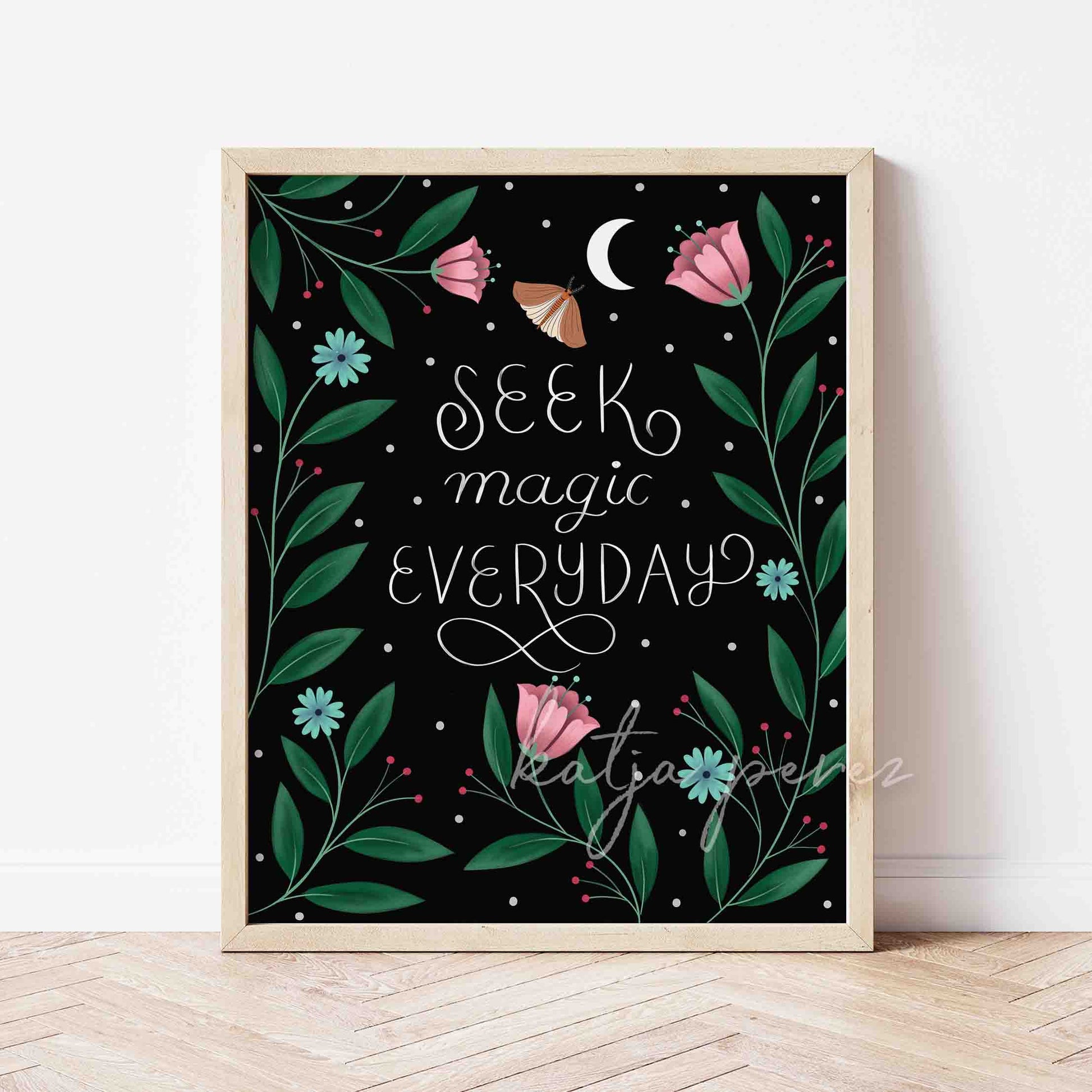 Bring a touch of magic into your daily life with the "Seek Magic Everyday" art print. This piece features a hand-lettered quote reminding you to seek magic in everyday life. Surrounded by a beautiful image of a moon and nature, this print is perfect for anyone who wants to add a touch of inspiration and wonder to their home. It's a great reminder to find magic in the simple things and to appreciate the beauty of nature.