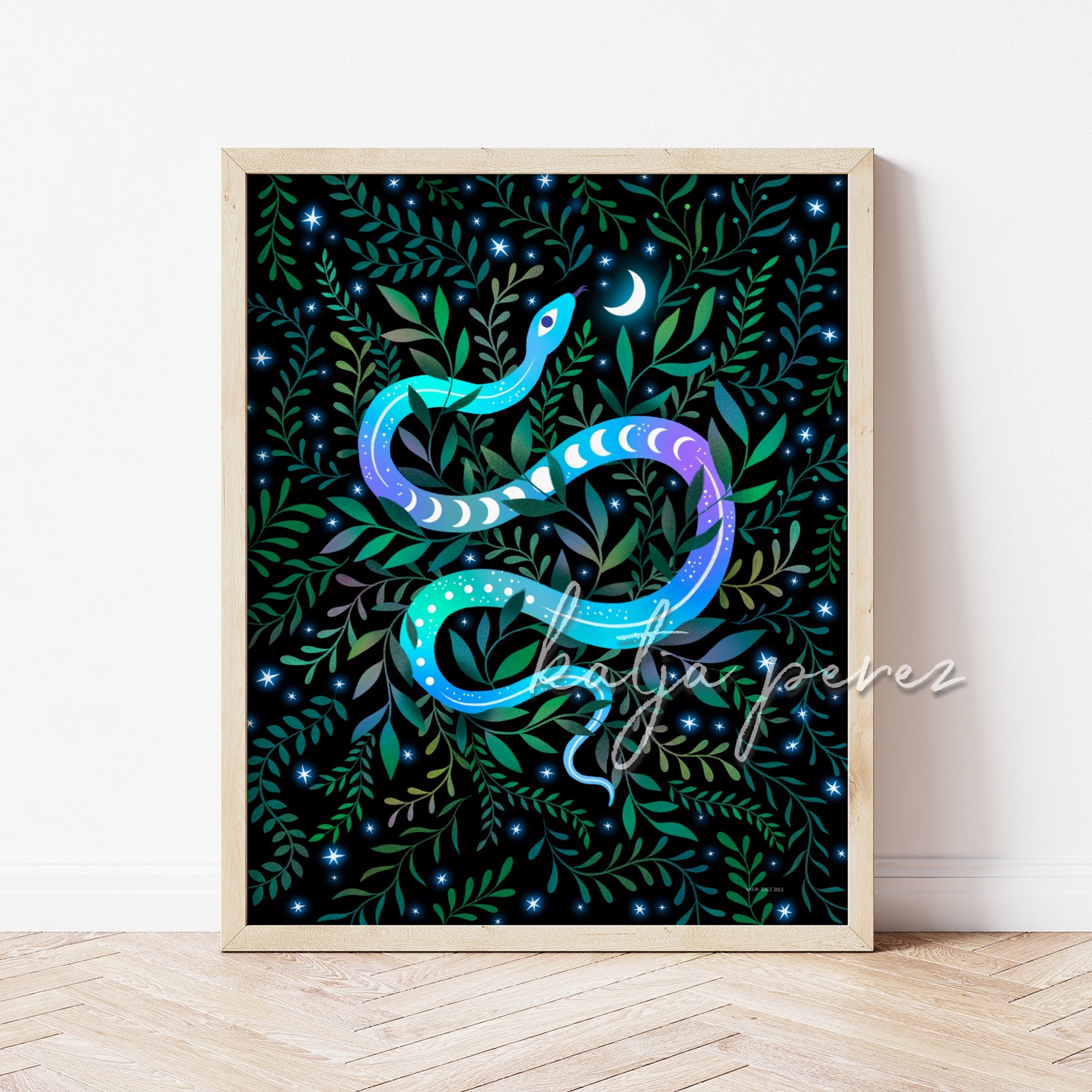 Serpent Moon is a beautiful illustration that depicts a captivating scene of a serpent, surrounded by lush and vibrant plant life, with a stunning moon and stars in the background. The snake is coiled gracefully among the greenery, giving off an air of tranquility and mystery. The celestial sky with its moon and stars creates a dreamy and magical atmosphere that perfectly complements the natural elements in the illustration.