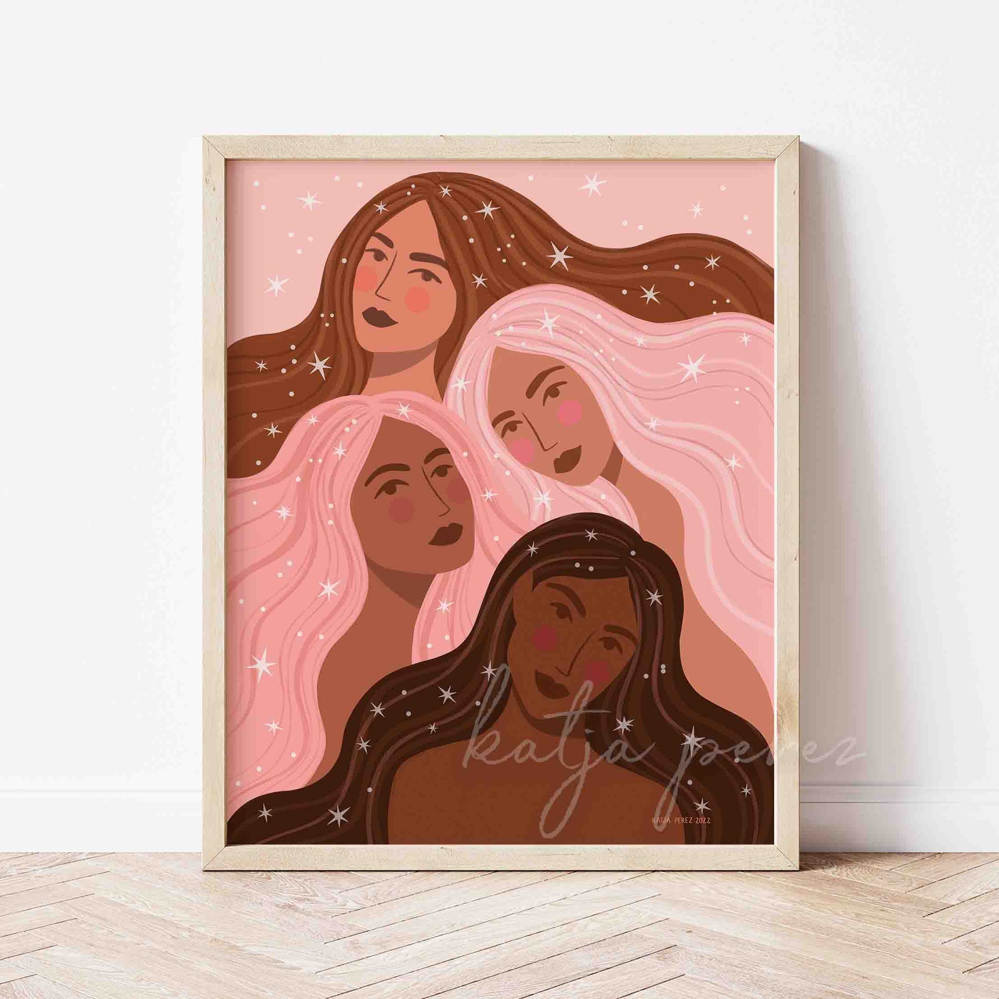 Celebrate diversity and women supporting each other with the We Are All Goddesses art print, featuring a group of women in soft, neutral colors, and stars. This print is a reminder that we are all goddesses in our own unique ways and it encourages women to support and uplift one another. It's perfect for anyone who wants to add a touch of inspiration and positivity to their home and to celebrate the diversity and strength of femininity.